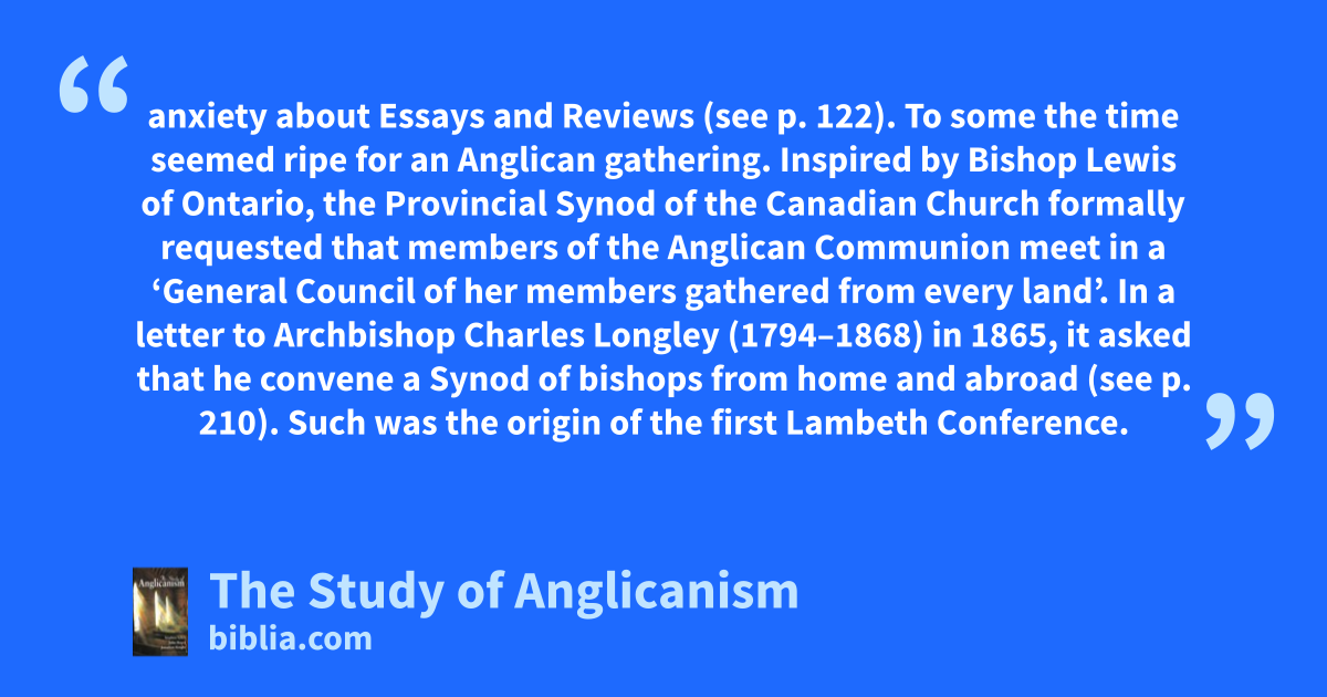 anxiety about Essays and Reviews (see p. 122). To some the time seemed ripe for an Anglican gathering. Inspired by Bishop Lewis of Ontario, the Provincial Synod of the Canadian Church formally requested that members of the Anglican Communion meet in a ‘General Council of her members gathered from every land’. In a letter to Archbishop Charles Longley (1794–1868) in 1865, it asked that he convene a Synod of bishops from home and abroad (see p. 210). Such was the origin of the first Lambeth Conference.