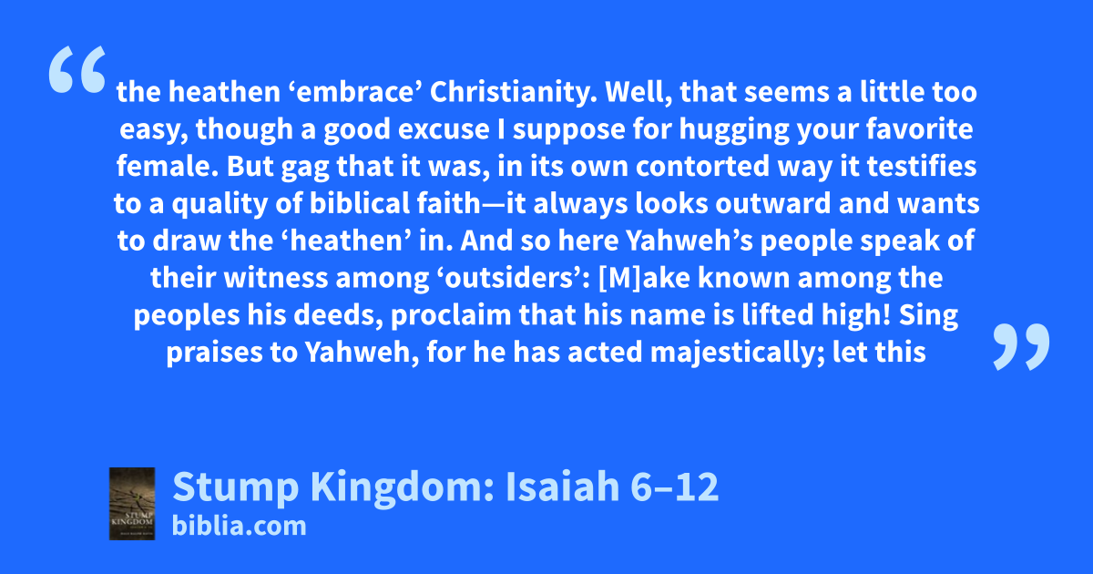 the heathen ‘embrace’ Christianity. Well, that seems a little too easy, though a good excuse I suppose for hugging your favorite female. But gag that it was, in its own contorted way it testifies to a quality of biblical faith—it always looks outward and wants to draw the ‘heathen’ in. And so here Yahweh’s people speak of their witness among ‘outsiders’: [M]ake known among the peoples his deeds, proclaim that his name is lifted high! Sing praises to Yahweh, for he has acted majestically; let this