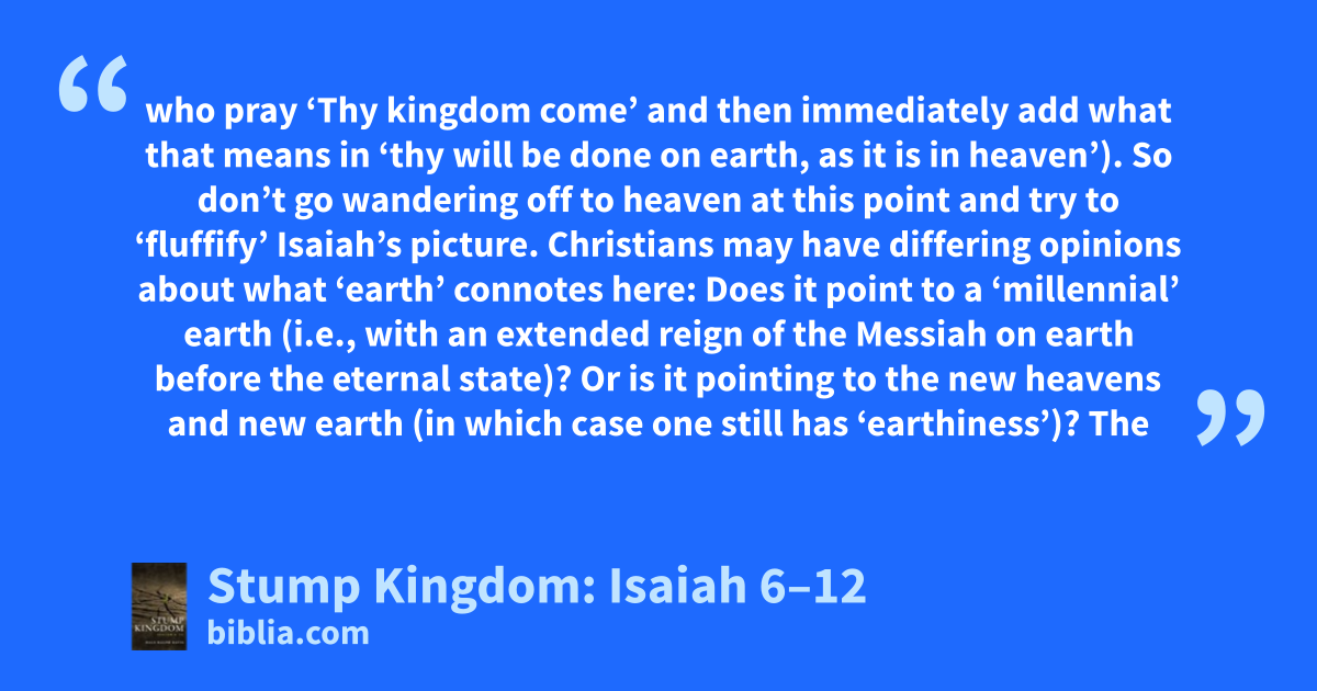 who pray ‘Thy kingdom come’ and then immediately add what that means in ‘thy will be done on earth, as it is in heaven’). So don’t go wandering off to heaven at this point and try to ‘fluffify’ Isaiah’s picture. Christians may have differing opinions about what ‘earth’ connotes here: Does it point to a ‘millennial’ earth (i.e., with an extended reign of the Messiah on earth before the eternal state)? Or is it pointing to the new heavens and new earth (in which case one still has ‘earthiness’)? The