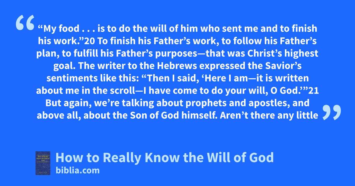 “My food . . . is to do the will of him who sent me and to finish his work.”20 To finish his Father’s work, to follow his Father’s plan, to fulfill his Father’s purposes—that was Christ’s highest goal. The writer to the Hebrews expressed the Savior’s sentiments like this: “Then I said, ‘Here I am—it is written about me in the scroll—I have come to do your will, O God.’”21 But again, we’re talking about prophets and apostles, and above all, about the Son of God himself. Aren’t there any little