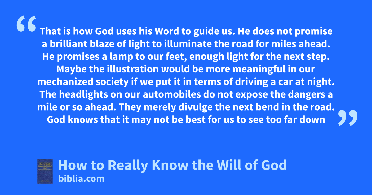 That is how God uses his Word to guide us. He does not promise a brilliant blaze of light to illuminate the road for miles ahead. He promises a lamp to our feet, enough light for the next step. Maybe the illustration would be more meaningful in our mechanized society if we put it in terms of driving a car at night. The headlights on our automobiles do not expose the dangers a mile or so ahead. They merely divulge the next bend in the road. God knows that it may not be best for us to see too far down