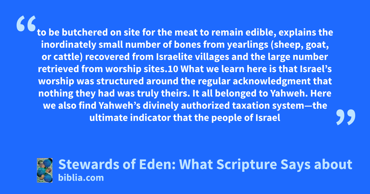 to be butchered on site for the meat to remain edible, explains the inordinately small number of bones from yearlings (sheep, goat, or cattle) recovered from Israelite villages and the large number retrieved from worship sites.10 What we learn here is that Israel’s worship was structured around the regular acknowledgment that nothing they had was truly theirs. It all belonged to Yahweh. Here we also find Yahweh’s divinely authorized taxation system—the ultimate indicator that the people of Israel