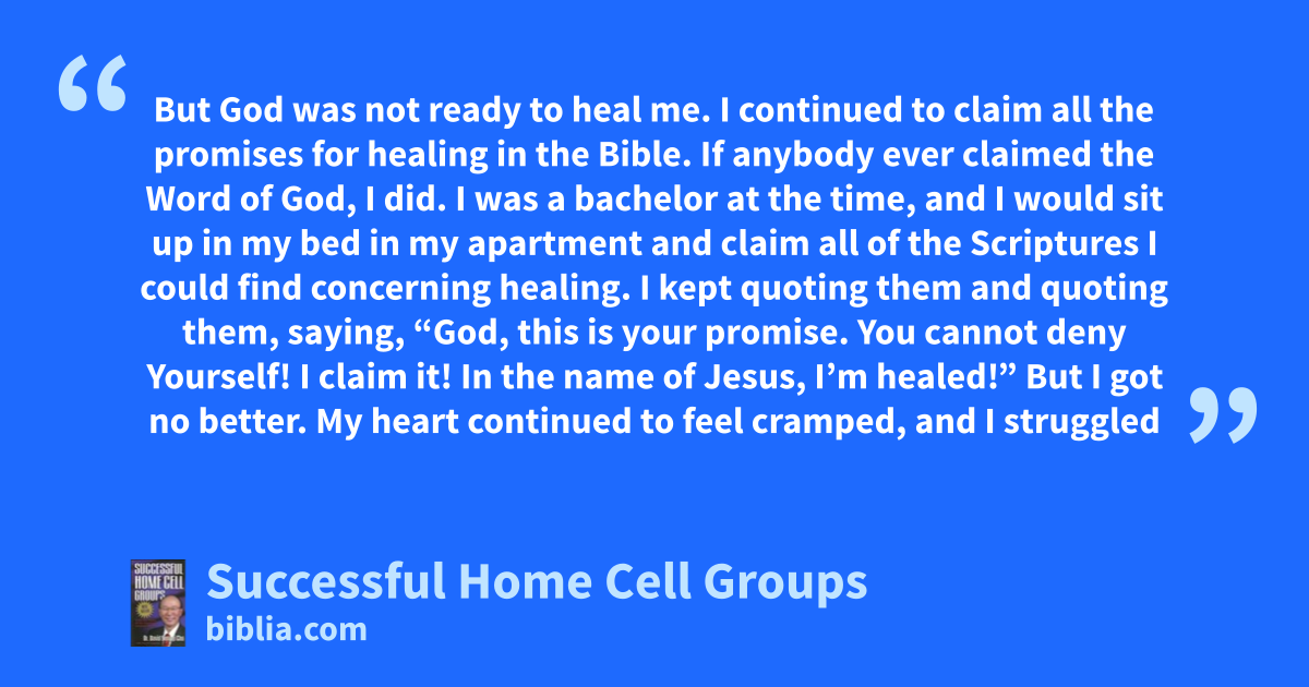 But God was not ready to heal me. I continued to claim all the promises for healing in the Bible. If anybody ever claimed the Word of God, I did. I was a bachelor at the time, and I would sit up in my bed in my apartment and claim all of the Scriptures I could find concerning healing. I kept quoting them and quoting them, saying, “God, this is your promise. You cannot deny Yourself! I claim it! In the name of Jesus, I’m healed!” But I got no better. My heart continued to feel cramped, and I struggled