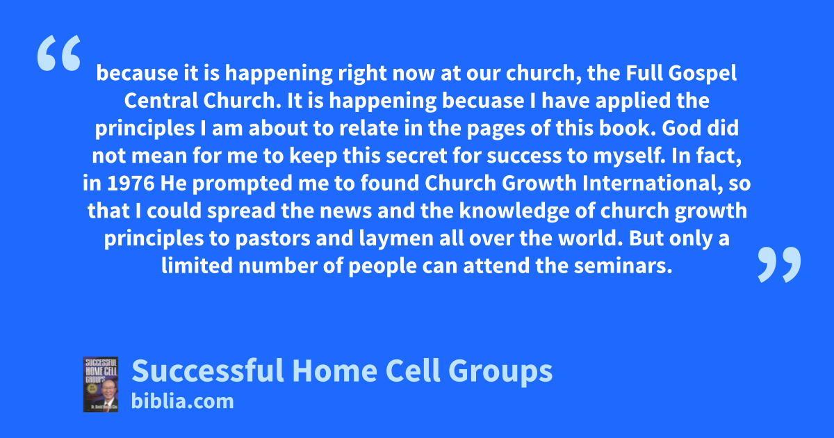 because it is happening right now at our church, the Full Gospel Central Church. It is happening becuase I have applied the principles I am about to relate in the pages of this book. God did not mean for me to keep this secret for success to myself. In fact, in 1976 He prompted me to found Church Growth International, so that I could spread the news and the knowledge of church growth principles to pastors and laymen all over the world. But only a limited number of people can attend the seminars.