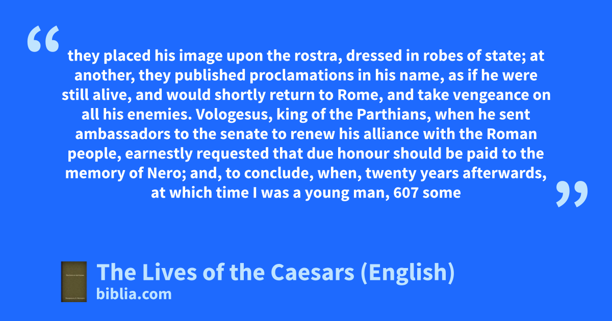 they placed his image upon the rostra, dressed in robes of state; at another, they published proclamations in his name, as if he were still alive, and would shortly return to Rome, and take vengeance on all his enemies. Vologesus, king of the Parthians, when he sent ambassadors to the senate to renew his alliance with the Roman people, earnestly requested that due honour should be paid to the memory of Nero; and, to conclude, when, twenty years afterwards, at which time I was a young man, 607 some