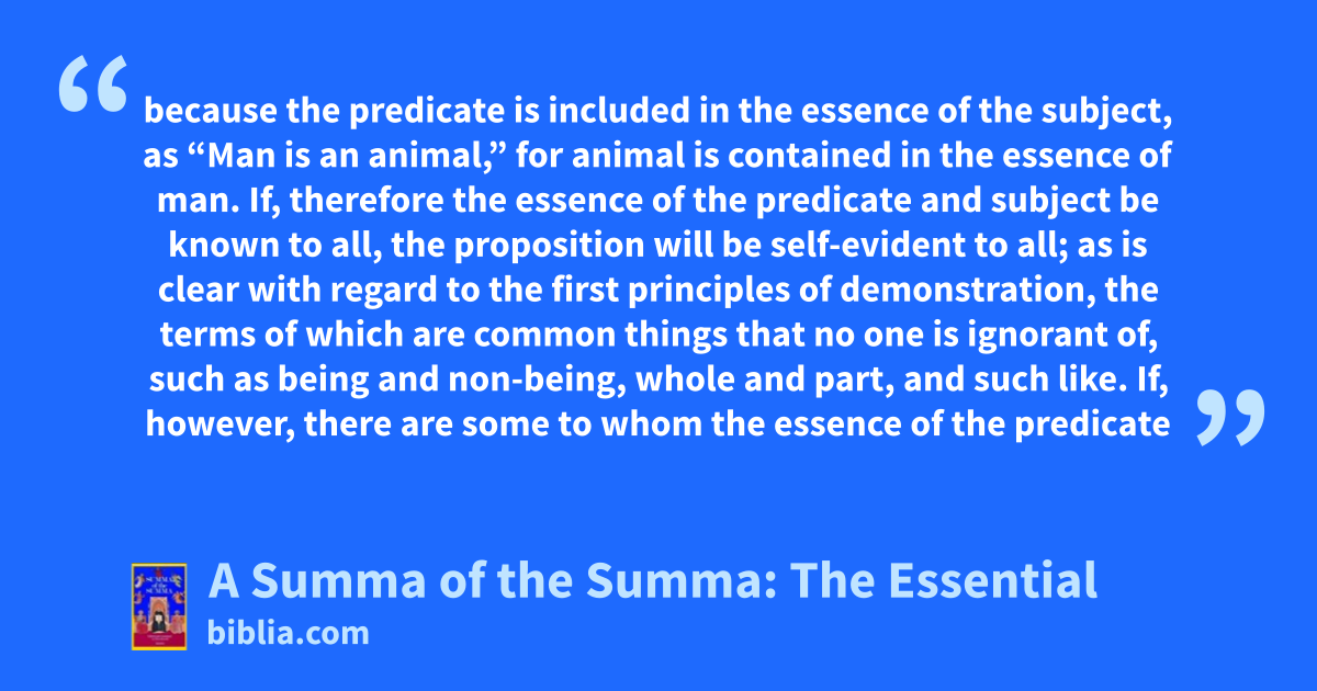 because the predicate is included in the essence of the subject, as “Man is an animal,” for animal is contained in the essence of man. If, therefore the essence of the predicate and subject be known to all, the proposition will be self-evident to all; as is clear with regard to the first principles of demonstration, the terms of which are common things that no one is ignorant of, such as being and non-being, whole and part, and such like. If, however, there are some to whom the essence of the predicate