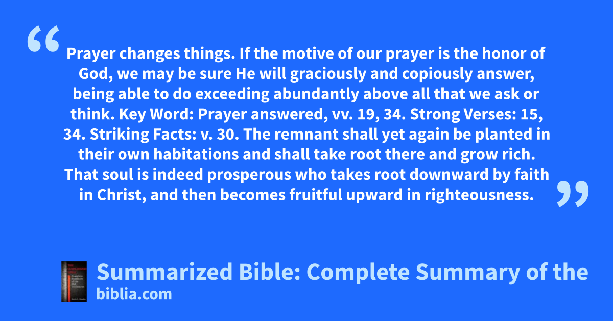 Conclusion: Prayer changes things. If the motive of our prayer is the honor of God, we may be sure He will graciously and copiously answer, being able to do exceeding abundantly above all that we ask or think.