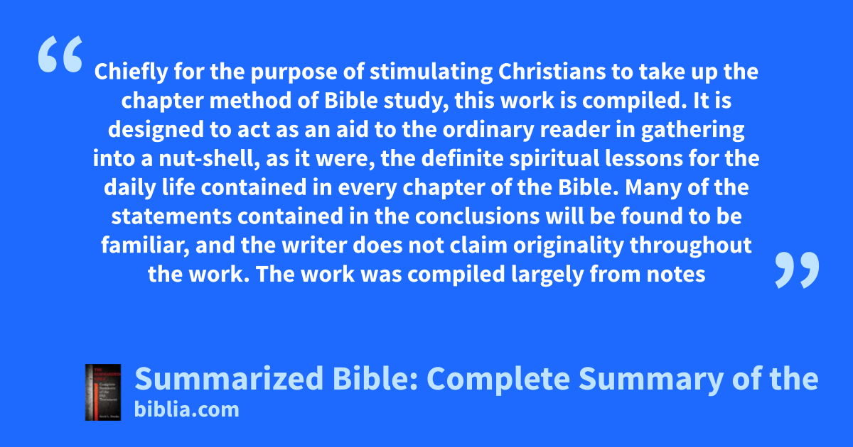 The Summarized Bible will also be found of value as a reference work. For the preacher who is in search of Scripture illustrations for his sermons, the “conclusions” will often suggest helpful applications. Many suggestive outlines will be found throughout which may be used as skeletons for sermons. The “striking facts” furnish foundation material for a study of Jesus Christ, as He appears in all the Scriptures.