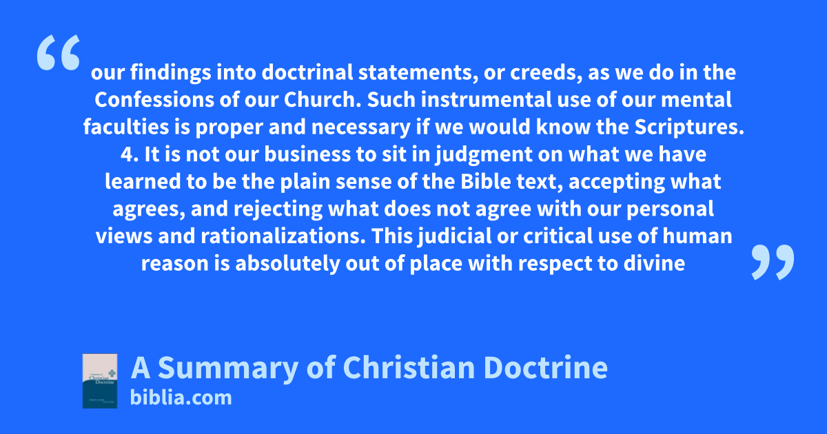our findings into doctrinal statements, or creeds, as we do in the Confessions of our Church. Such instrumental use of our mental faculties is proper and necessary if we would know the Scriptures. 4. It is not our business to sit in judgment on what we have learned to be the plain sense of the Bible text, accepting what agrees, and rejecting what does not agree with our personal views and rationalizations. This judicial or critical use of human reason is absolutely out of place with respect to divine