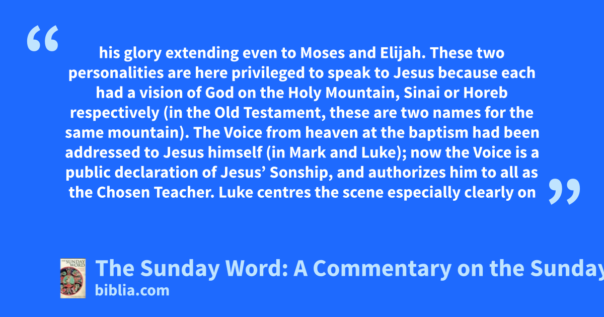 his glory extending even to Moses and Elijah. These two personalities are here privileged to speak to Jesus because each had a vision of God on the Holy Mountain, Sinai or Horeb respectively (in the Old Testament, these are two names for the same mountain). The Voice from heaven at the baptism had been addressed to Jesus himself (in Mark and Luke); now the Voice is a public declaration of Jesus’ Sonship, and authorizes him to all as the Chosen Teacher. Luke centres the scene especially clearly on