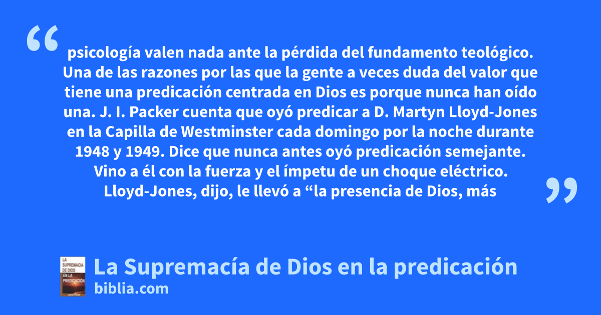 psicología valen nada ante la pérdida del fundamento teológico. Una de las razones por las que la gente a veces duda del valor que tiene una predicación centrada en Dios es porque nunca han oído una. J. I. Packer cuenta que oyó predicar a D. Martyn Lloyd-Jones en la Capilla de Westminster cada domingo por la noche durante 1948 y 1949. Dice que nunca antes oyó predicación semejante. Vino a él con la fuerza y el ímpetu de un choque eléctrico. Lloyd-Jones, dijo, le llevó a “la presencia de Dios, más