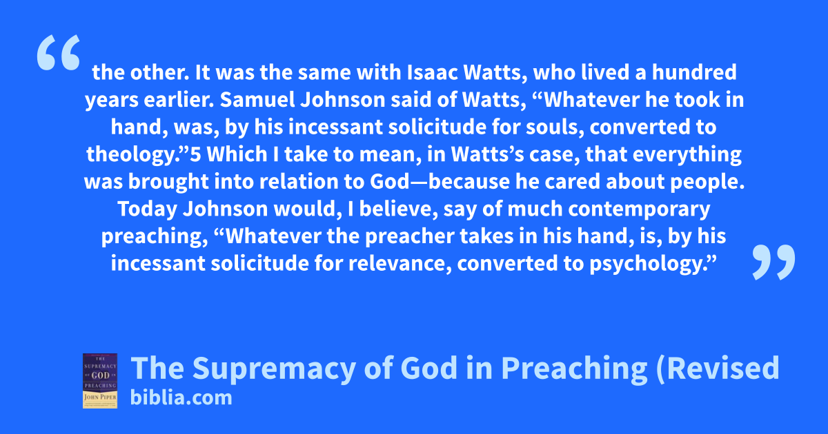 the other. It was the same with Isaac Watts, who lived a hundred years earlier. Samuel Johnson said of Watts, “Whatever he took in hand, was, by his incessant solicitude for souls, converted to theology.”5 Which I take to mean, in Watts’s case, that everything was brought into relation to God—because he cared about people. Today Johnson would, I believe, say of much contemporary preaching, “Whatever the preacher takes in his hand, is, by his incessant solicitude for relevance, converted to psychology.”