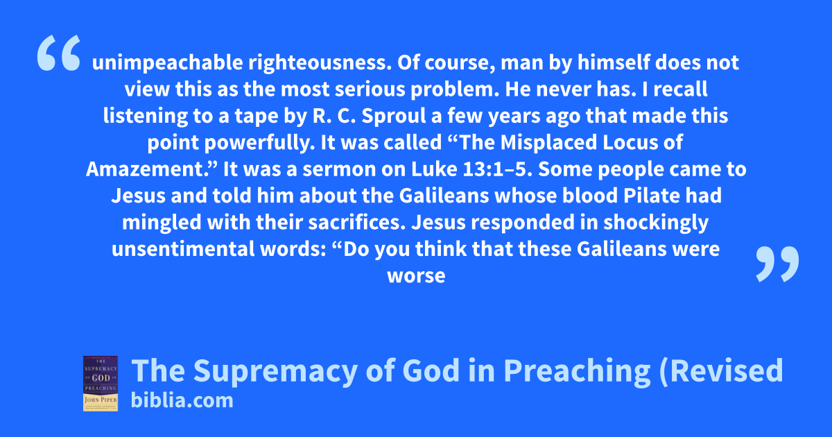 unimpeachable righteousness. Of course, man by himself does not view this as the most serious problem. He never has. I recall listening to a tape by R. C. Sproul a few years ago that made this point powerfully. It was called “The Misplaced Locus of Amazement.” It was a sermon on Luke 13:1–5. Some people came to Jesus and told him about the Galileans whose blood Pilate had mingled with their sacrifices. Jesus responded in shockingly unsentimental words: “Do you think that these Galileans were worse
