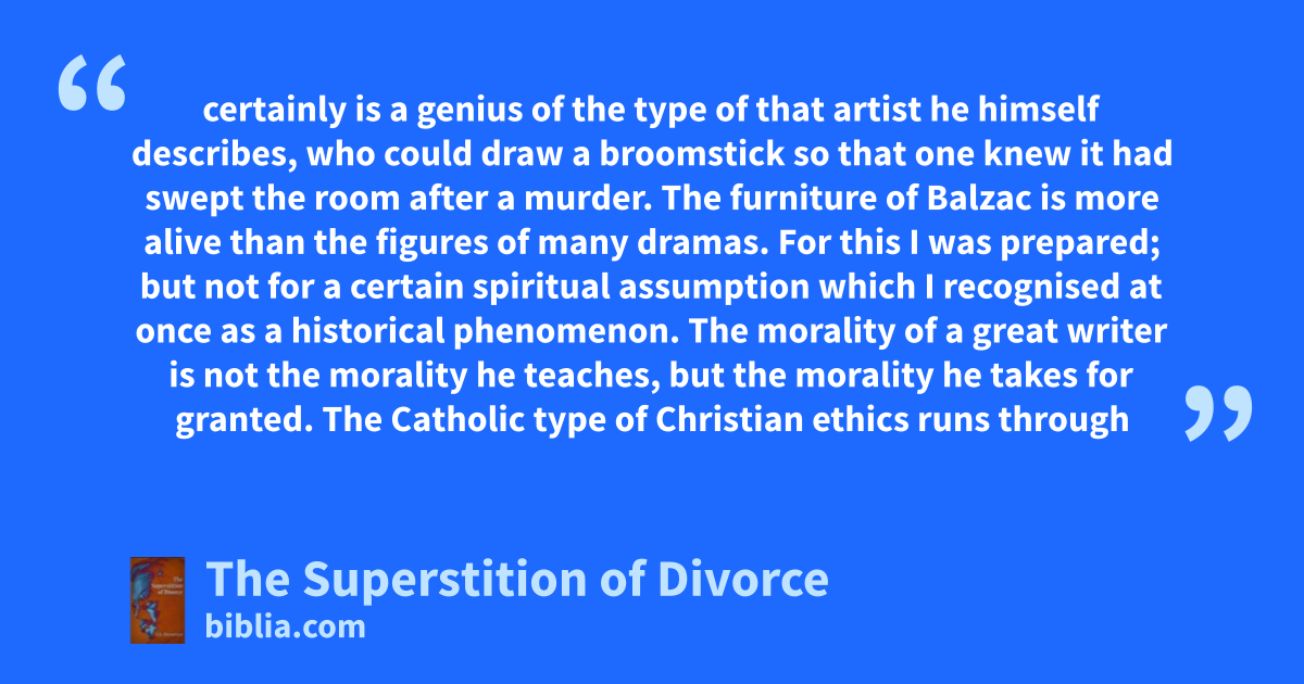 certainly is a genius of the type of that artist he himself describes, who could draw a broomstick so that one knew it had swept the room after a murder. The furniture of Balzac is more alive than the figures of many dramas. For this I was prepared; but not for a certain spiritual assumption which I recognised at once as a historical phenomenon. The morality of a great writer is not the morality he teaches, but the morality he takes for granted. The Catholic type of Christian ethics runs through