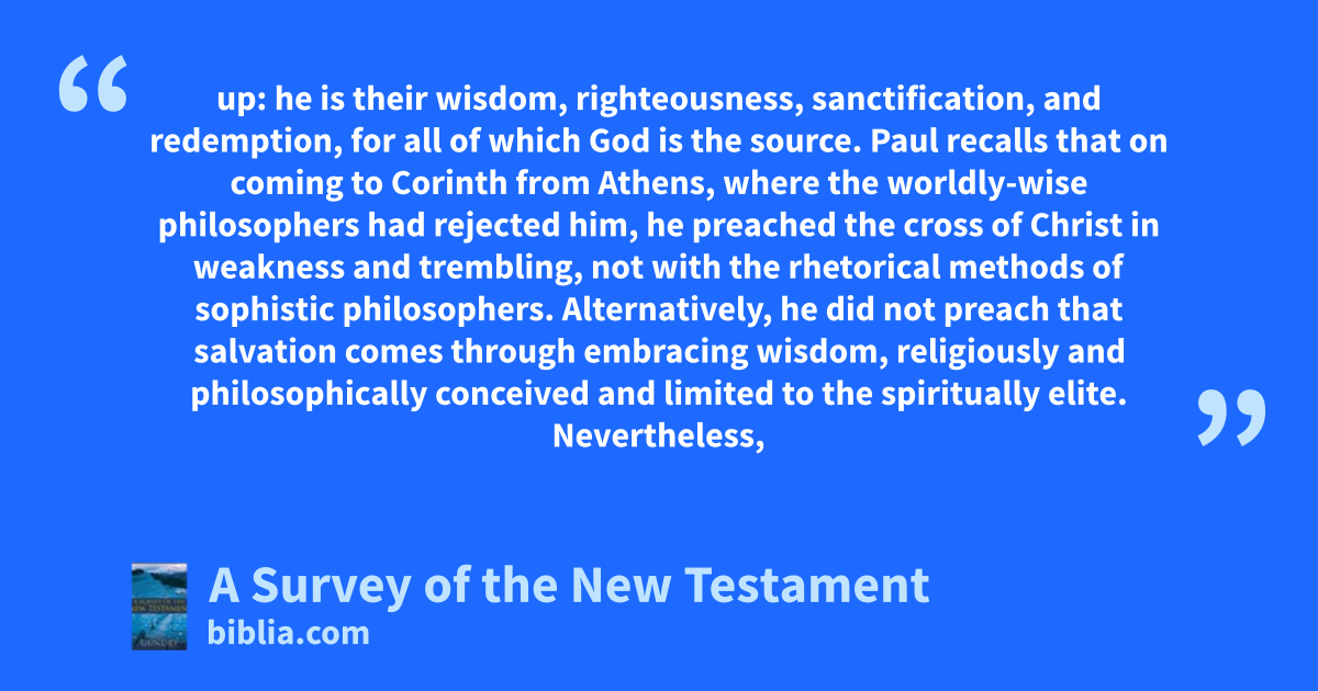 up: he is their wisdom, righteousness, sanctification, and redemption, for all of which God is the source. Paul recalls that on coming to Corinth from Athens, where the worldly-wise philosophers had rejected him, he preached the cross of Christ in weakness and trembling, not with the rhetorical methods of sophistic philosophers. Alternatively, he did not preach that salvation comes through embracing wisdom, religiously and philosophically conceived and limited to the spiritually elite. Nevertheless,
