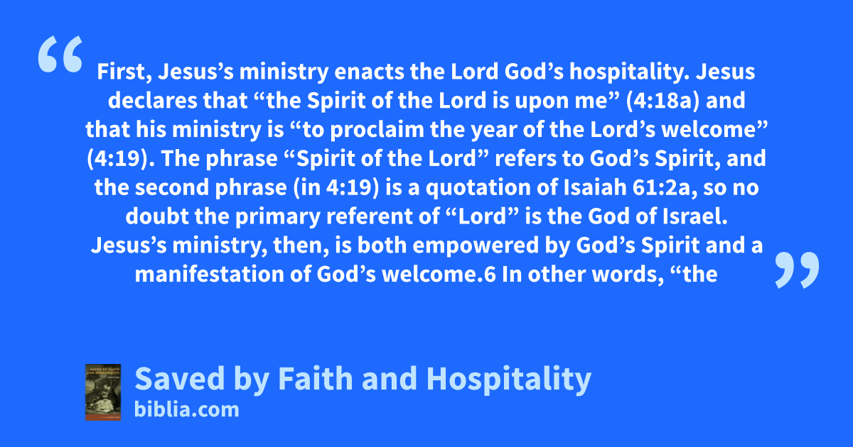 First, Jesus’s ministry enacts the Lord God’s hospitality. Jesus declares that “the Spirit of the Lord is upon me” (4:18a) and that his ministry is “to proclaim the year of the Lord’s welcome” (4:19). The phrase “Spirit of the Lord” refers to God’s Spirit, and the second phrase (in 4:19) is a quotation of Isaiah 61:2a, so no doubt the primary referent of “Lord” is the God of Israel. Jesus’s ministry, then, is both empowered by God’s Spirit and a manifestation of God’s welcome.6 In other words, “the
