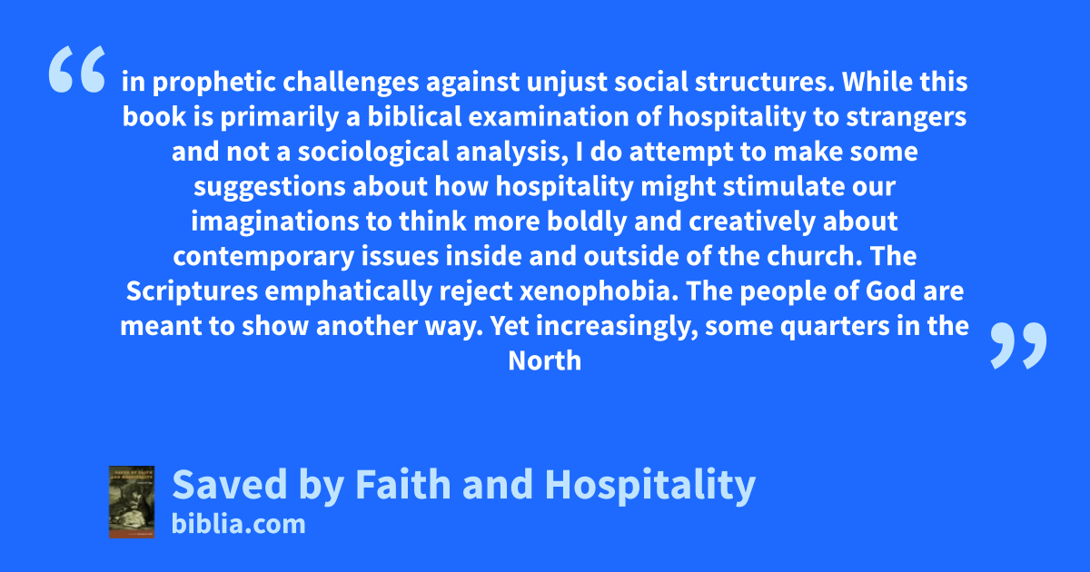 in prophetic challenges against unjust social structures. While this book is primarily a biblical examination of hospitality to strangers and not a sociological analysis, I do attempt to make some suggestions about how hospitality might stimulate our imaginations to think more boldly and creatively about contemporary issues inside and outside of the church. The Scriptures emphatically reject xenophobia. The people of God are meant to show another way. Yet increasingly, some quarters in the North