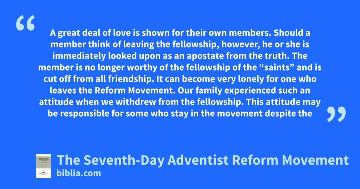 A great deal of love is shown for their own members. Should a member think of leaving the fellowship, however, he or she is immediately looked upon as an apostate from the truth. The member is no longer worthy of the fellowship of the “saints” and is cut off from all friendship. It can become very lonely for one who leaves the Reform Movement. Our family experienced such an attitude when we withdrew from the fellowship. This attitude may be responsible for some who stay in the movement despite the