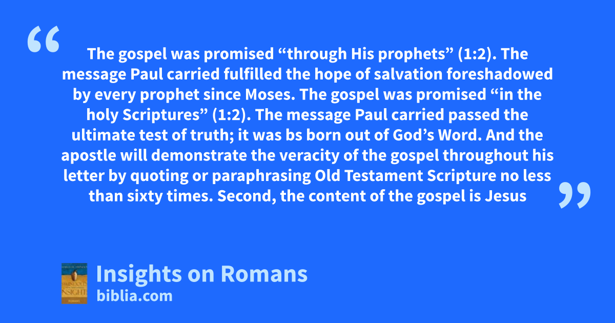 The gospel was promised “through His prophets” (1:2). The message Paul carried fulfilled the hope of salvation foreshadowed by every prophet since Moses. The gospel was promised “in the holy Scriptures” (1:2). The message Paul carried passed the ultimate test of truth; it was bs born out of God’s Word. And the apostle will demonstrate the veracity of the gospel throughout his letter by quoting or paraphrasing Old Testament Scripture no less than sixty times. Second, the content of the gospel is Jesus
