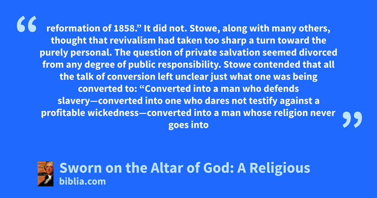 reformation of 1858.” It did not. Stowe, along with many others, thought that revivalism had taken too sharp a turn toward the purely personal. The question of private salvation seemed divorced from any degree of public responsibility. Stowe contended that all the talk of conversion left unclear just what one was being converted to: “Converted into a man who defends slavery—converted into one who dares not testify against a profitable wickedness—converted into a man whose religion never goes into