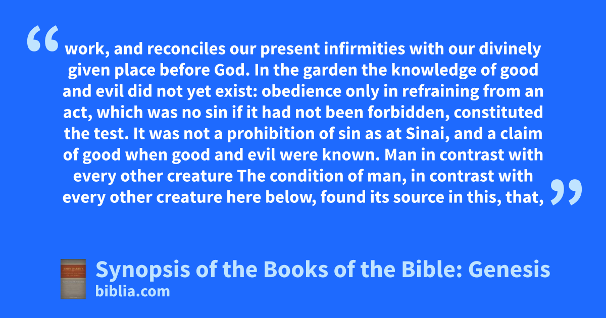 work, and reconciles our present infirmities with our divinely given place before God. In the garden the knowledge of good and evil did not yet exist: obedience only in refraining from an act, which was no sin if it had not been forbidden, constituted the test. It was not a prohibition of sin as at Sinai, and a claim of good when good and evil were known. Man in contrast with every other creature The condition of man, in contrast with every other creature here below, found its source in this, that,