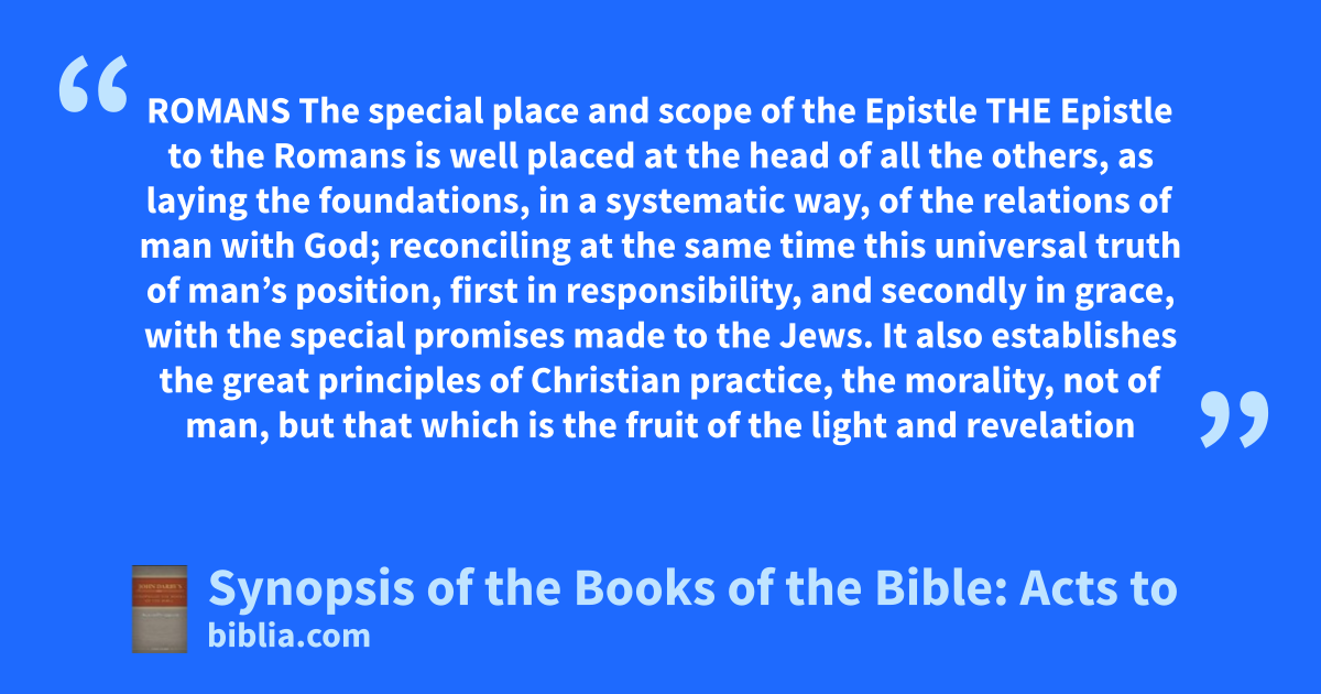 ROMANS The special place and scope of the Epistle THE Epistle to the Romans is well placed at the head of all the others, as laying the foundations, in a systematic way, of the relations of man with God; reconciling at the same time this universal truth of man’s position, first in responsibility, and secondly in grace, with the special promises made to the Jews. It also establishes the great principles of Christian practice, the morality, not of man, but that which is the fruit of the light and revelation