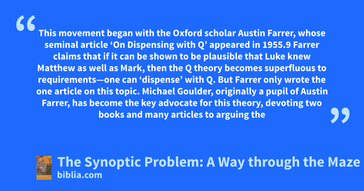 This movement began with the Oxford scholar Austin Farrer, whose seminal article ‘On Dispensing with Q’ appeared in 1955.9 Farrer claims that if it can be shown to be plausible that Luke knew Matthew as well as Mark, then the Q theory becomes superfluous to requirements—one can ‘dispense’ with Q. But Farrer only wrote the one article on this topic. Michael Goulder, originally a pupil of Austin Farrer, has become the key advocate for this theory, devoting two books and many articles to arguing the