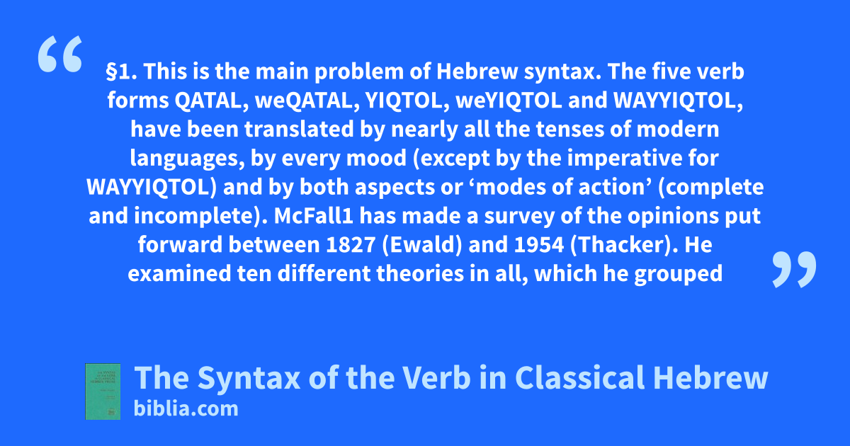 §1. This is the main problem of Hebrew syntax. The five verb forms QATAL, weQATAL, YIQTOL, weYIQTOL and WAYYIQTOL, have been translated by nearly all the tenses of modern languages, by every mood (except by the imperative for WAYYIQTOL) and by both aspects or ‘modes of action’ (complete and incomplete). McFall1 has made a survey of the opinions put forward between 1827 (Ewald) and 1954 (Thacker). He examined ten different theories in all, which he grouped