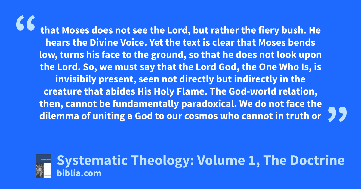 that Moses does not see the Lord, but rather the fiery bush. He hears the Divine Voice. Yet the text is clear that Moses bends low, turns his face to the ground, so that he does not look upon the Lord. So, we must say that the Lord God, the One Who Is, is invisibily present, seen not directly but indirectly in the creature that abides His Holy Flame. The God-world relation, then, cannot be fundamentally paradoxical. We do not face the dilemma of uniting a God to our cosmos who cannot in truth or