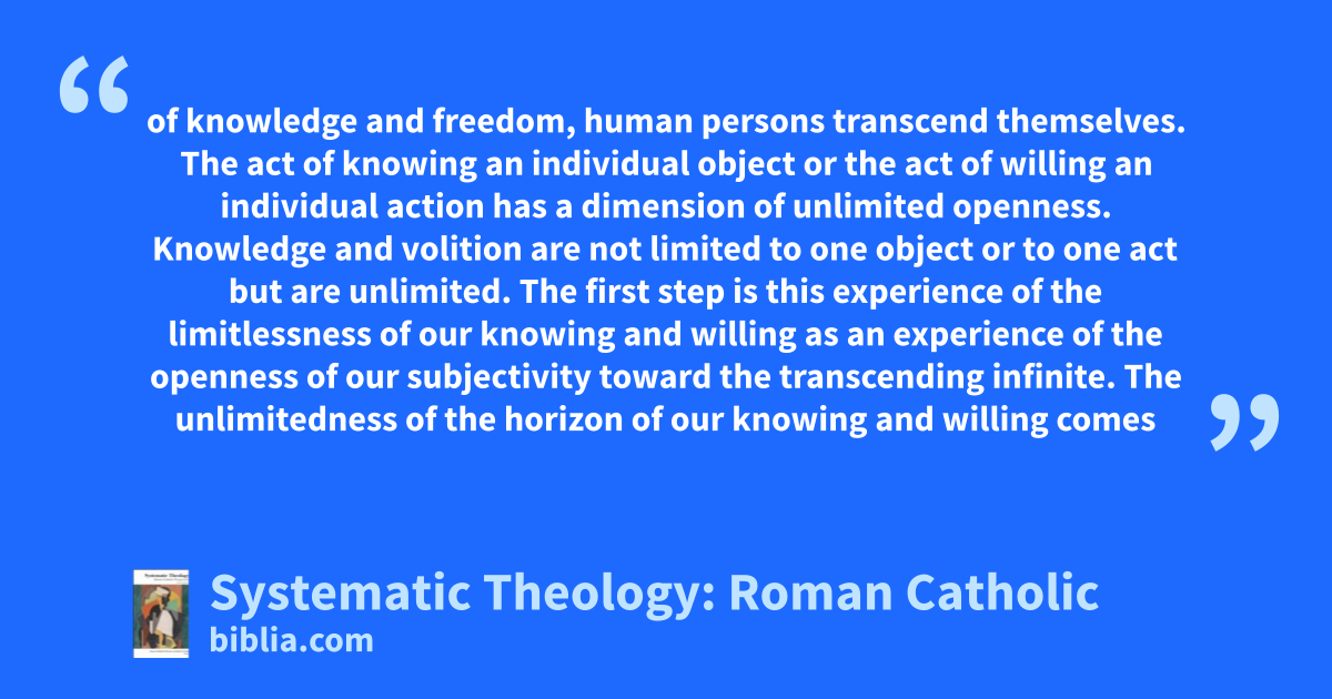 of knowledge and freedom, human persons transcend themselves. The act of knowing an individual object or the act of willing an individual action has a dimension of unlimited openness. Knowledge and volition are not limited to one object or to one act but are unlimited. The first step is this experience of the limitlessness of our knowing and willing as an experience of the openness of our subjectivity toward the transcending infinite. The unlimitedness of the horizon of our knowing and willing comes