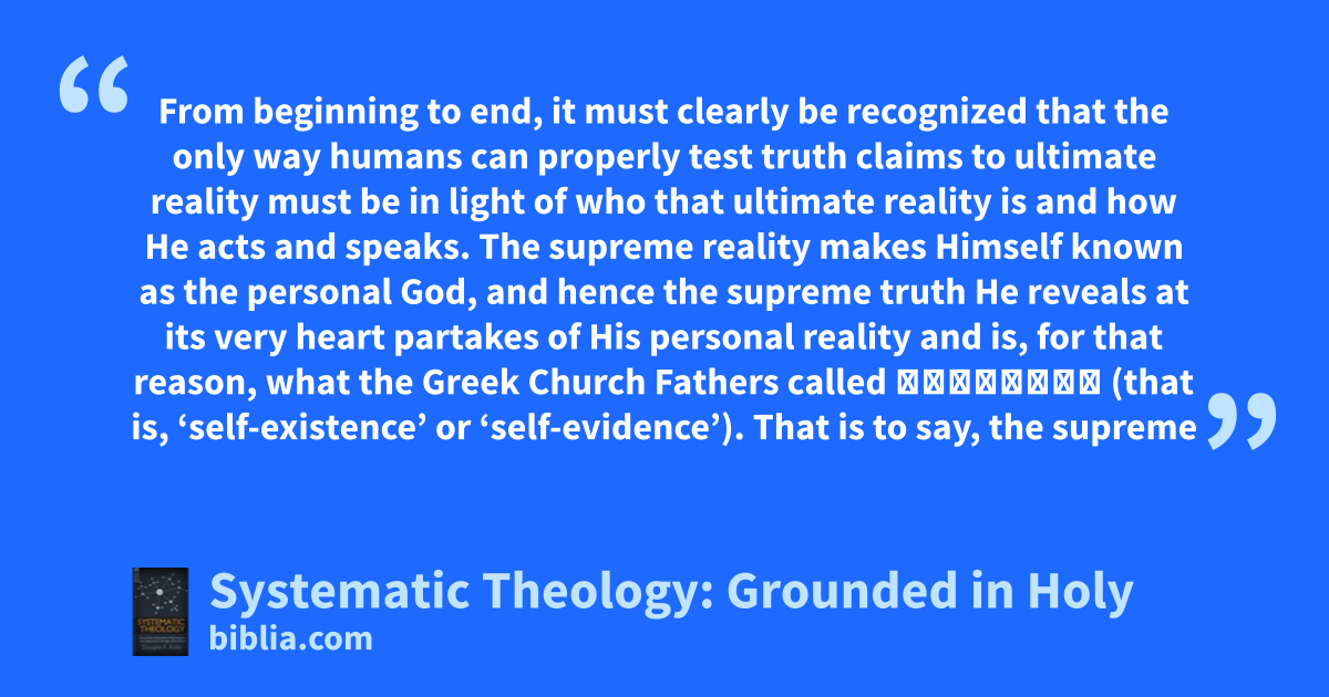 From beginning to end, it must clearly be recognized that the only way humans can properly test truth claims to ultimate reality must be in light of who that ultimate reality is and how He acts and speaks. The supreme reality makes Himself known as the personal God, and hence the supreme truth He reveals at its very heart partakes of His personal reality and is, for that reason, what the Greek Church Fathers called αὐτουσία (that is, ‘self-existence’ or ‘self-evidence’). That is to say, the supreme