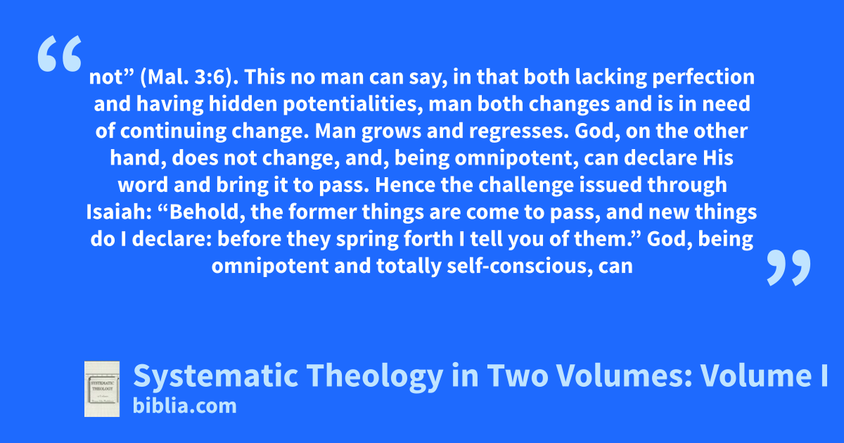 not” (Mal. 3:6). This no man can say, in that both lacking perfection and having hidden potentialities, man both changes and is in need of continuing change. Man grows and regresses. God, on the other hand, does not change, and, being omnipotent, can declare His word and bring it to pass. Hence the challenge issued through Isaiah: “Behold, the former things are come to pass, and new things do I declare: before they spring forth I tell you of them.” God, being omnipotent and totally self-conscious, can