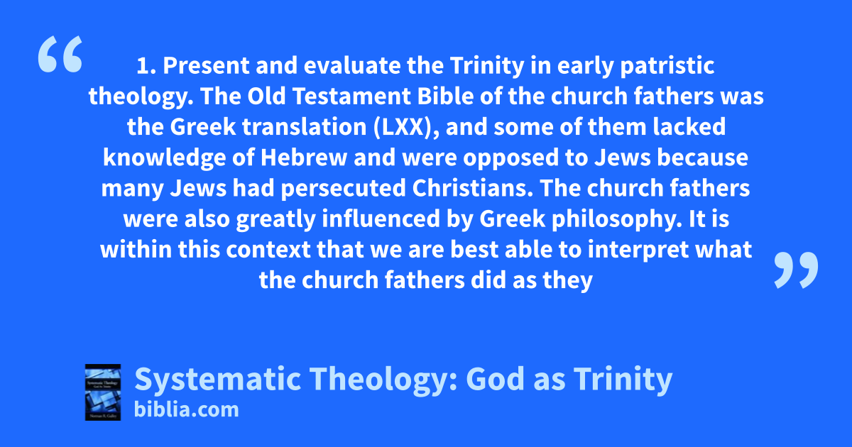 1. Present and evaluate the Trinity in early patristic theology. The Old Testament Bible of the church fathers was the Greek translation (LXX), and some of them lacked knowledge of Hebrew and were opposed to Jews because many Jews had persecuted Christians. The church fathers were also greatly influenced by Greek philosophy. It is within this context that we are best able to interpret what the church fathers did as they