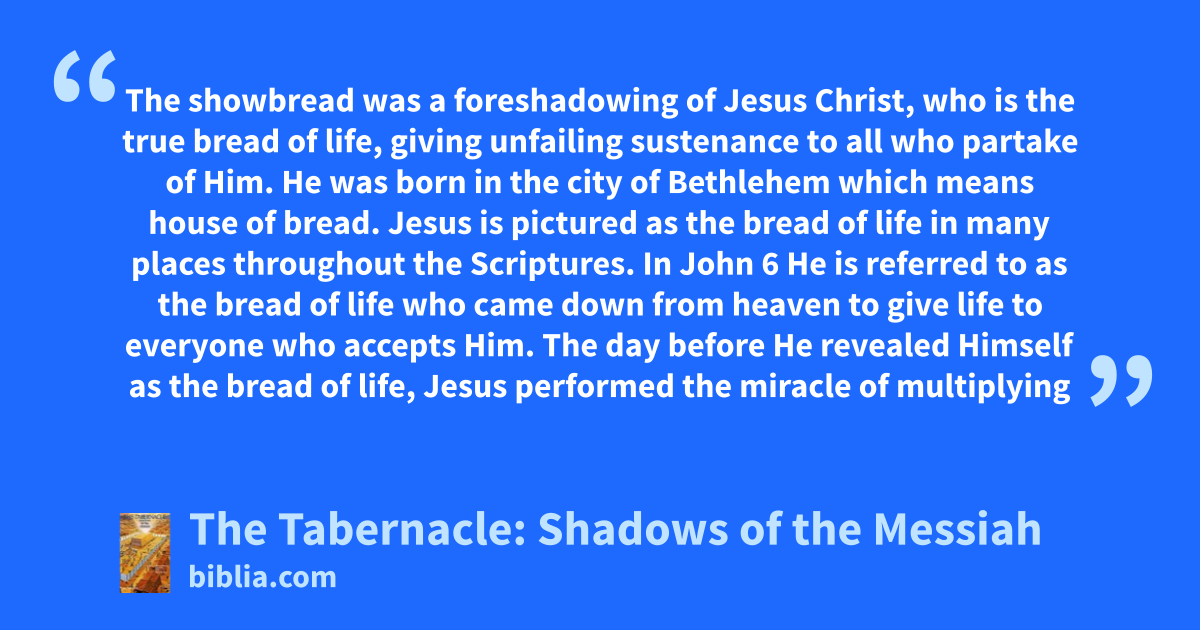 The showbread was a foreshadowing of Jesus Christ, who is the true bread of life, giving unfailing sustenance to all who partake of Him. He was born in the city of Bethlehem which means house of bread. Jesus is pictured as the bread of life in many places throughout the Scriptures. In John 6 He is referred to as the bread of life who came down from heaven to give life to everyone who accepts Him. The day before He revealed Himself as the bread of life, Jesus performed the miracle of multiplying