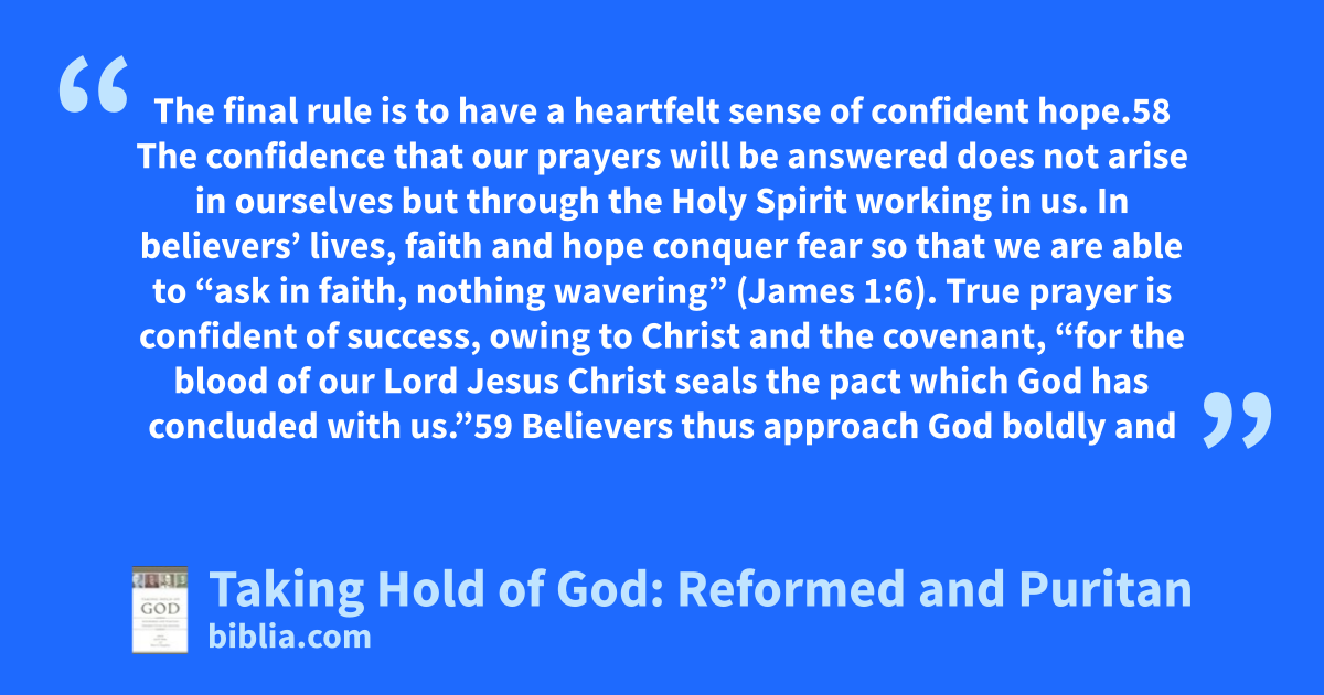The final rule is to have a heartfelt sense of confident hope.58 The confidence that our prayers will be answered does not arise in ourselves but through the Holy Spirit working in us. In believers’ lives, faith and hope conquer fear so that we are able to “ask in faith, nothing wavering” (James 1:6). True prayer is confident of success, owing to Christ and the covenant, “for the blood of our Lord Jesus Christ seals the pact which God has concluded with us.”59 Believers thus approach God boldly and