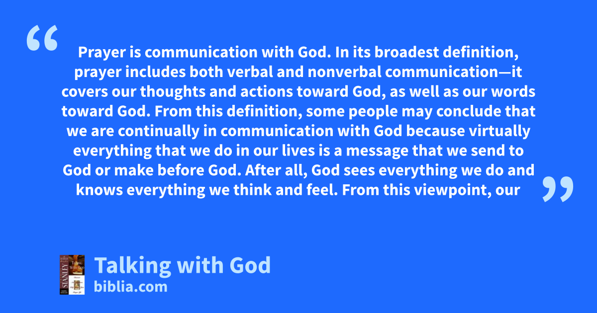 Prayer is communication with God. In its broadest definition, prayer includes both verbal and nonverbal communication—it covers our thoughts and actions toward God, as well as our words toward God. From this definition, some people may conclude that we are continually in communication with God because virtually everything that we do in our lives is a message that we send to God or make before God. After all, God sees everything we do and knows everything we think and feel. From this viewpoint, our