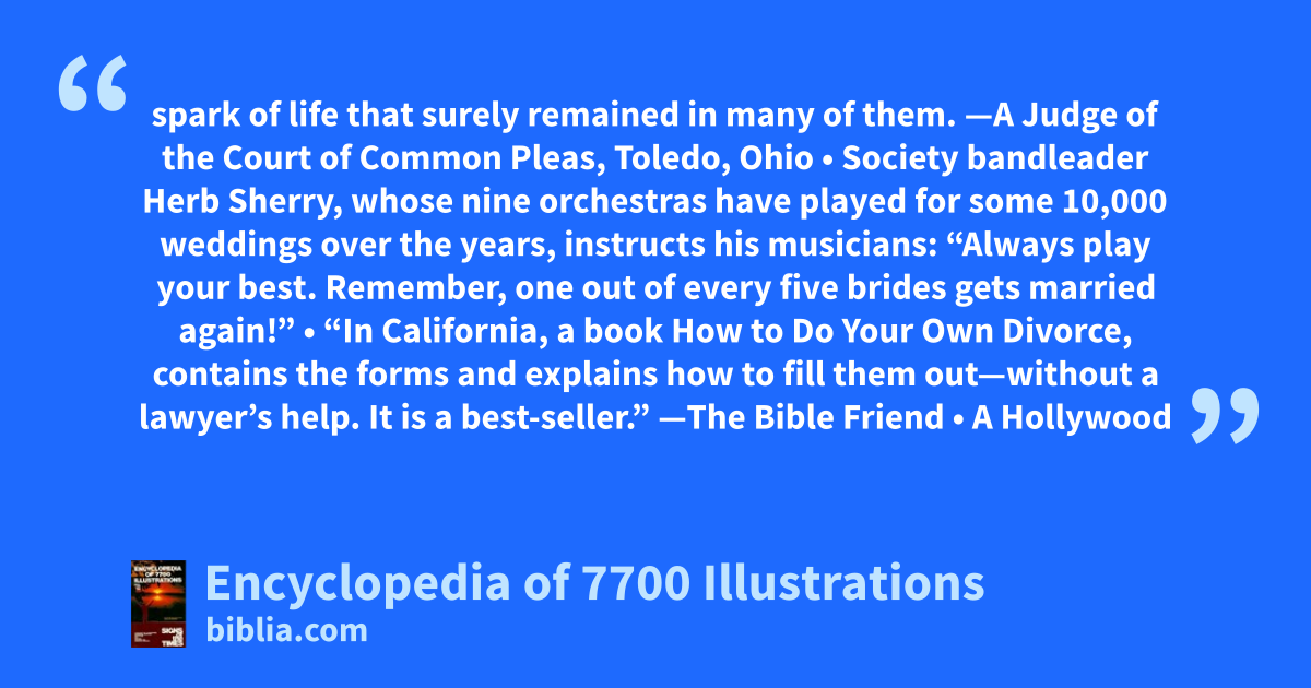 spark of life that surely remained in many of them. —A Judge of the Court of Common Pleas, Toledo, Ohio • Society bandleader Herb Sherry, whose nine orchestras have played for some 10,000 weddings over the years, instructs his musicians: “Always play your best. Remember, one out of every five brides gets married again!” • “In California, a book How to Do Your Own Divorce, contains the forms and explains how to fill them out—without a lawyer’s help. It is a best-seller.” —The Bible Friend • A Hollywood