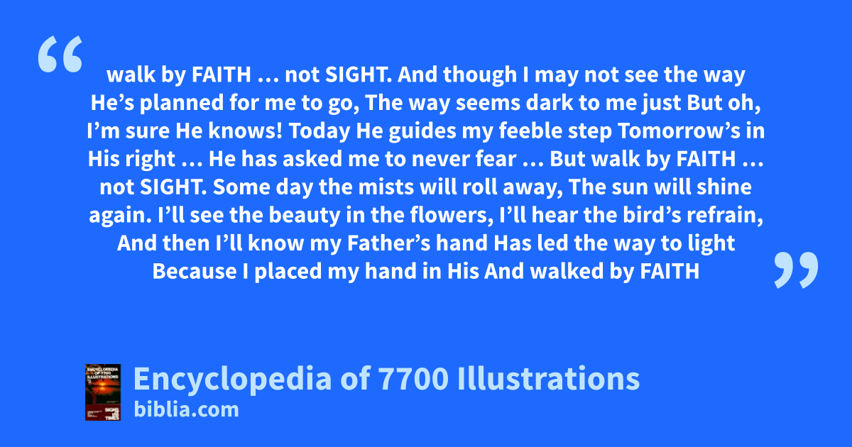 walk by FAITH … not SIGHT. And though I may not see the way He’s planned for me to go, The way seems dark to me just But oh, I’m sure He knows! Today He guides my feeble step Tomorrow’s in His right … He has asked me to never fear … But walk by FAITH … not SIGHT. Some day the mists will roll away, The sun will shine again. I’ll see the beauty in the flowers, I’ll hear the bird’s refrain, And then I’ll know my Father’s hand Has led the way to light Because I placed my hand in His And walked by FAITH