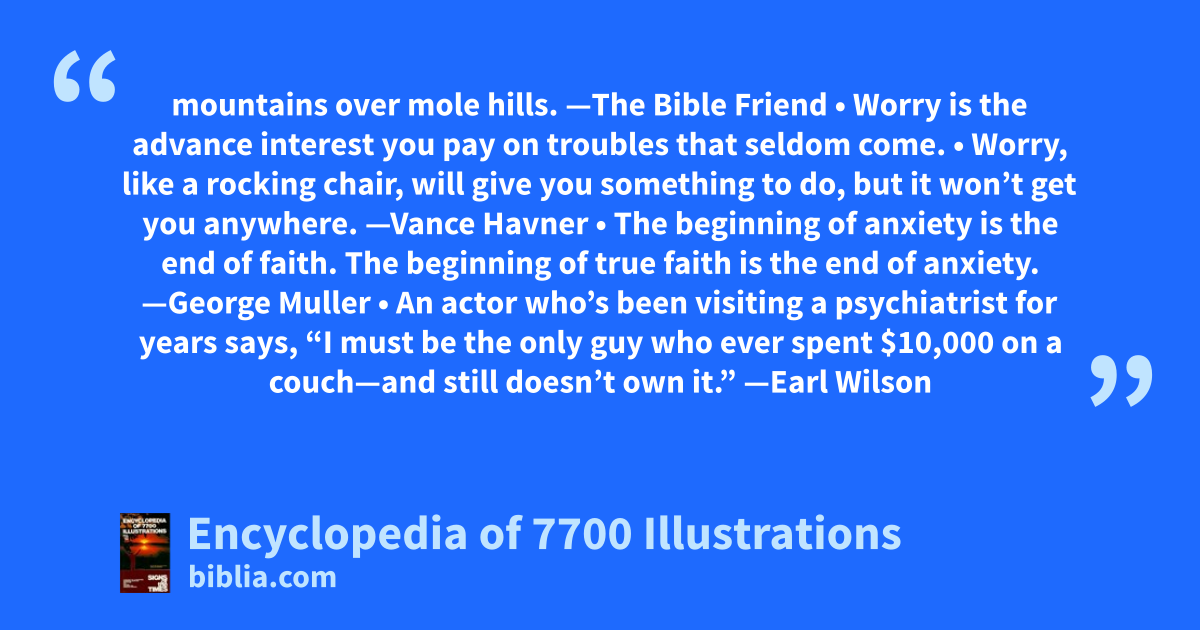 mountains over mole hills. —The Bible Friend • Worry is the advance interest you pay on troubles that seldom come. • Worry, like a rocking chair, will give you something to do, but it won’t get you anywhere. —Vance Havner • The beginning of anxiety is the end of faith. The beginning of true faith is the end of anxiety. —George Muller • An actor who’s been visiting a psychiatrist for years says, “I must be the only guy who ever spent $10,000 on a couch—and still doesn’t own it.” —Earl Wilson