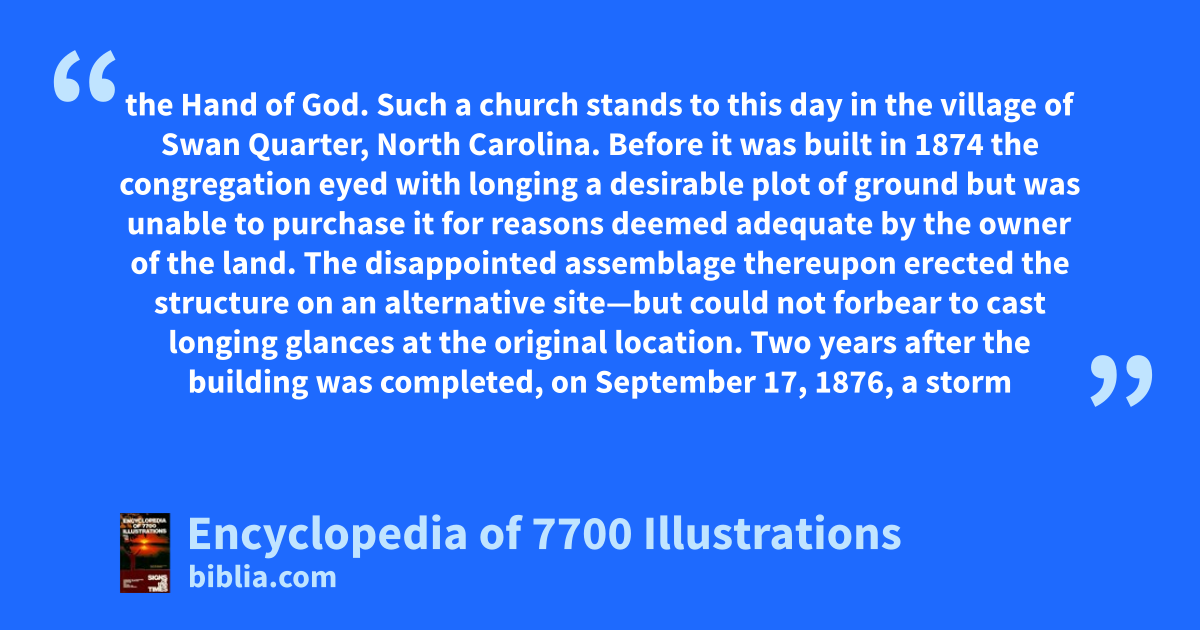 the Hand of God. Such a church stands to this day in the village of Swan Quarter, North Carolina. Before it was built in 1874 the congregation eyed with longing a desirable plot of ground but was unable to purchase it for reasons deemed adequate by the owner of the land. The disappointed assemblage thereupon erected the structure on an alternative site—but could not forbear to cast longing glances at the original location. Two years after the building was completed, on September 17, 1876, a storm