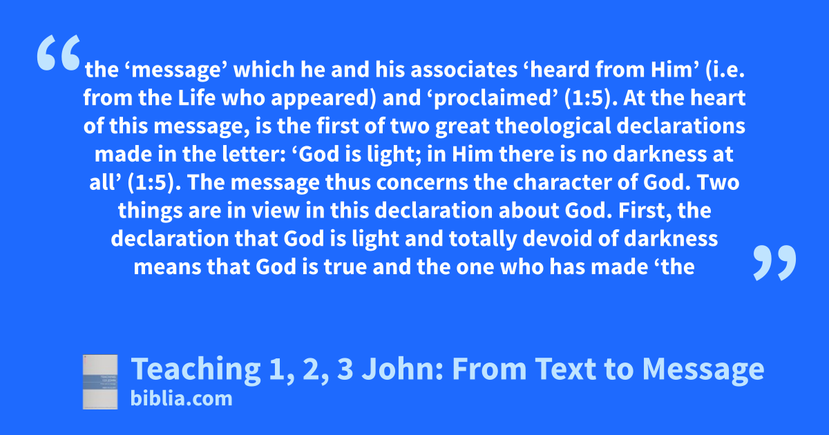 the ‘message’ which he and his associates ‘heard from Him’ (i.e. from the Life who appeared) and ‘proclaimed’ (1:5). At the heart of this message, is the first of two great theological declarations made in the letter: ‘God is light; in Him there is no darkness at all’ (1:5). The message thus concerns the character of God. Two things are in view in this declaration about God. First, the declaration that God is light and totally devoid of darkness means that God is true and the one who has made ‘the