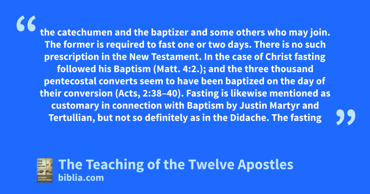 the catechumen and the baptizer and some others who may join. The former is required to fast one or two days. There is no such prescription in the New Testament. In the case of Christ fasting followed his Baptism (Matt. 4:2.); and the three thousand pentecostal converts seem to have been baptized on the day of their conversion (Acts, 2:38–40). Fasting is likewise mentioned as customary in connection with Baptism by Justin Martyr and Tertullian, but not so definitely as in the Didache. The fasting