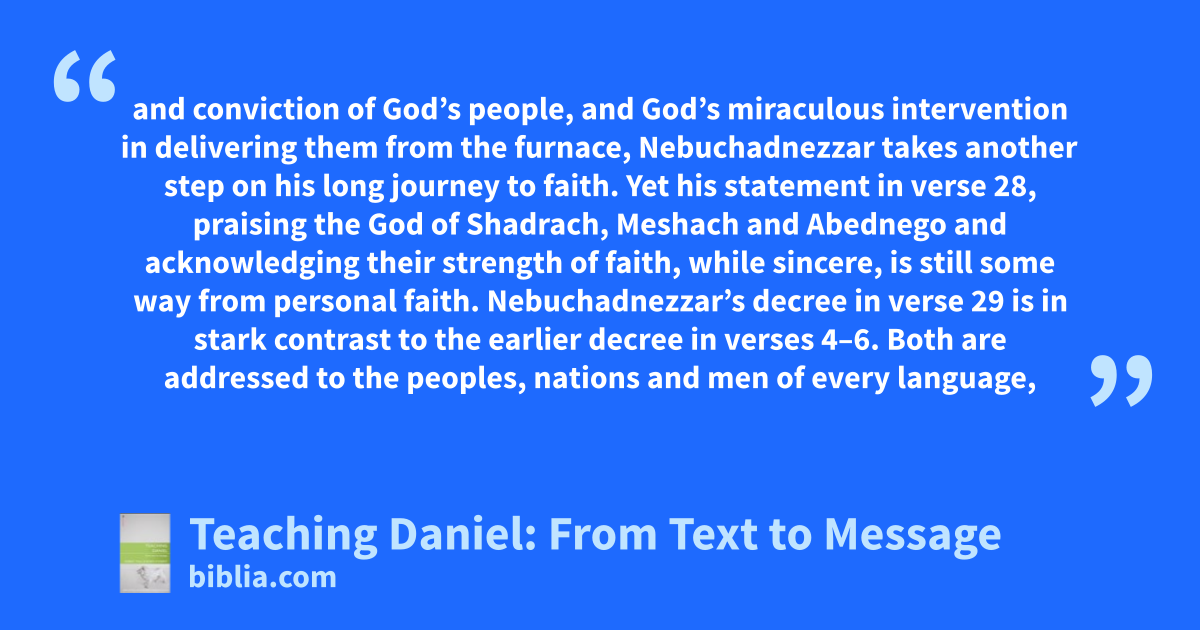and conviction of God’s people, and God’s miraculous intervention in delivering them from the furnace, Nebuchadnezzar takes another step on his long journey to faith. Yet his statement in verse 28, praising the God of Shadrach, Meshach and Abednego and acknowledging their strength of faith, while sincere, is still some way from personal faith. Nebuchadnezzar’s decree in verse 29 is in stark contrast to the earlier decree in verses 4–6. Both are addressed to the peoples, nations and men of every language,