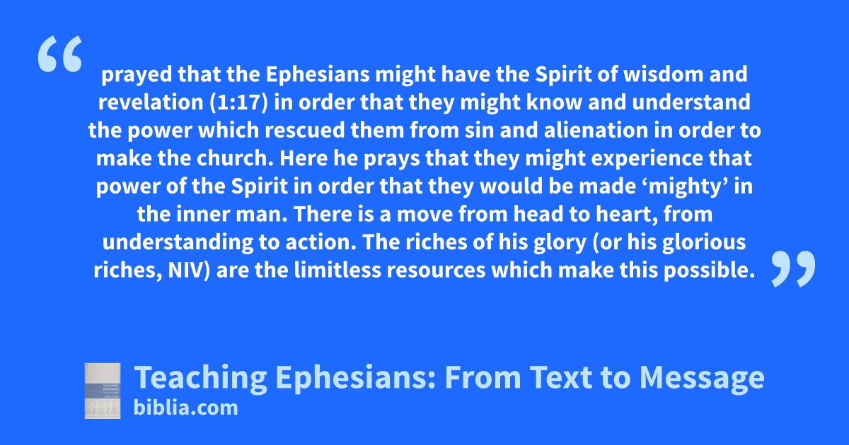 prayed that the Ephesians might have the Spirit of wisdom and revelation (1:17) in order that they might know and understand the power which rescued them from sin and alienation in order to make the church. Here he prays that they might experience that power of the Spirit in order that they would be made ‘mighty’ in the inner man. There is a move from head to heart, from understanding to action. The riches of his glory (or his glorious riches, NIV) are the limitless resources which make this possible.