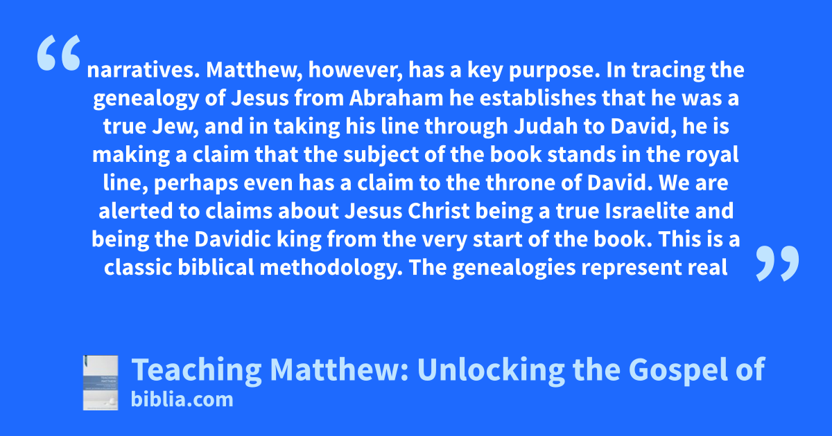 narratives. Matthew, however, has a key purpose. In tracing the genealogy of Jesus from Abraham he establishes that he was a true Jew, and in taking his line through Judah to David, he is making a claim that the subject of the book stands in the royal line, perhaps even has a claim to the throne of David. We are alerted to claims about Jesus Christ being a true Israelite and being the Davidic king from the very start of the book. This is a classic biblical methodology. The genealogies represent real