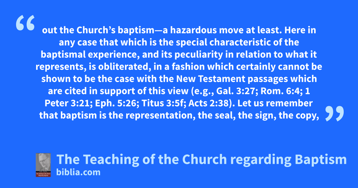 out the Church’s baptism—a hazardous move at least. Here in any case that which is the special characteristic of the baptismal experience, and its peculiarity in relation to what it represents, is obliterated, in a fashion which certainly cannot be shown to be the case with the New Testament passages which are cited in support of this view (e.g., Gal. 3:27; Rom. 6:4; 1 Peter 3:21; Eph. 5:26; Titus 3:5f; Acts 2:38). Let us remember that baptism is the representation, the seal, the sign, the copy,