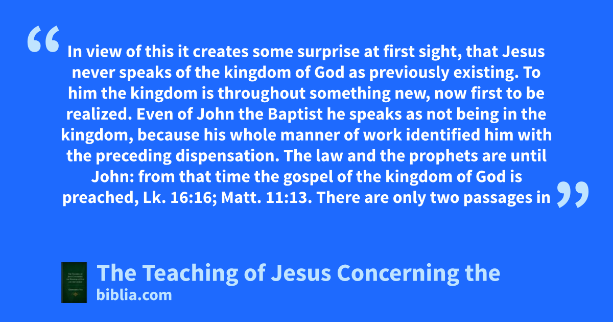 In view of this it creates some surprise at first sight, that Jesus never speaks of the kingdom of God as previously existing. To him the kingdom is throughout something new, now first to be realized. Even of John the Baptist he speaks as not being in the kingdom, because his whole manner of work identified him with the preceding dispensation. The law and the prophets are until John: from that time the gospel of the kingdom of God is preached, Lk. 16:16; Matt. 11:13. There are only two passages in