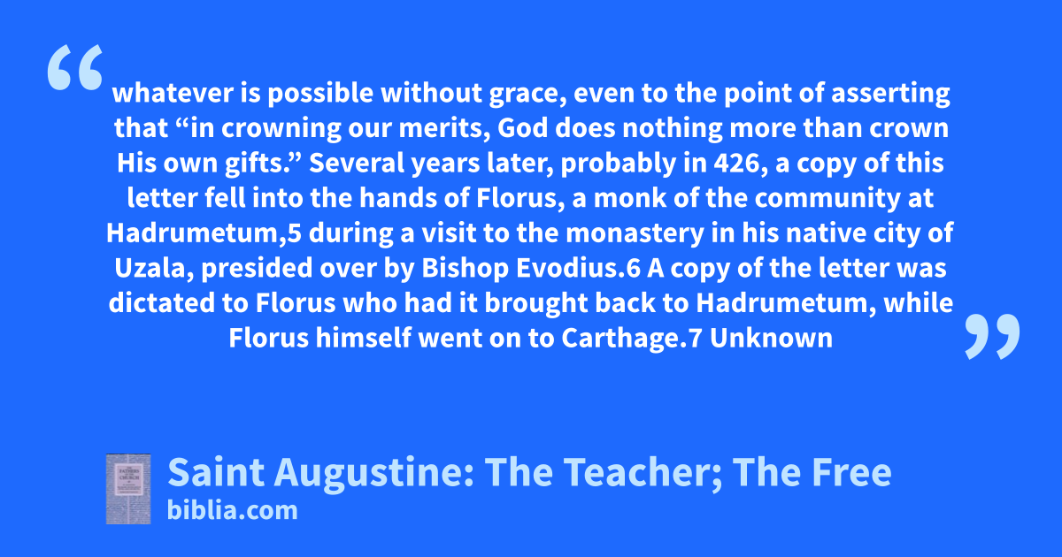 whatever is possible without grace, even to the point of asserting that “in crowning our merits, God does nothing more than crown His own gifts.” Several years later, probably in 426, a copy of this letter fell into the hands of Florus, a monk of the community at Hadrumetum,5 during a visit to the monastery in his native city of Uzala, presided over by Bishop Evodius.6 A copy of the letter was dictated to Florus who had it brought back to Hadrumetum, while Florus himself went on to Carthage.7 Unknown