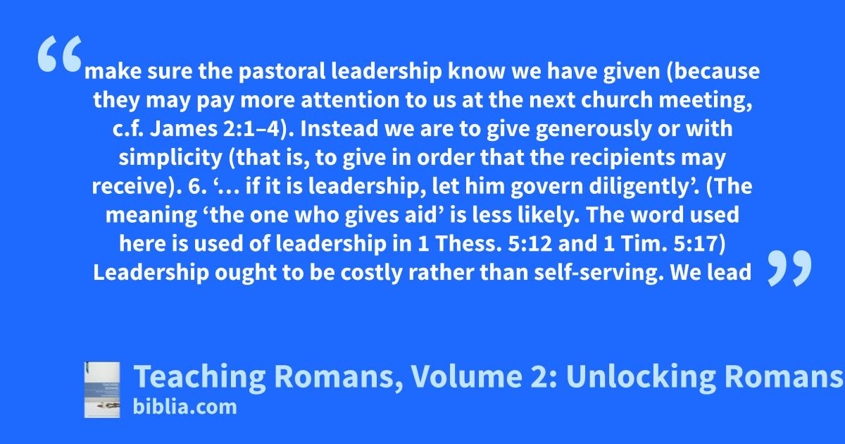 make sure the pastoral leadership know we have given (because they may pay more attention to us at the next church meeting, c.f. James 2:1–4). Instead we are to give generously or with simplicity (that is, to give in order that the recipients may receive). 6. ‘… if it is leadership, let him govern diligently’. (The meaning ‘the one who gives aid’ is less likely. The word used here is used of leadership in 1 Thess. 5:12 and 1 Tim. 5:17) Leadership ought to be costly rather than self-serving. We lead