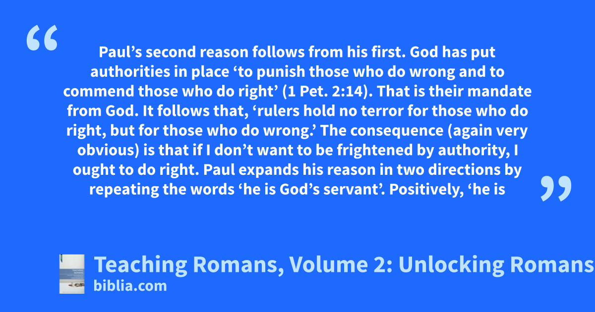 Paul’s second reason follows from his first. God has put authorities in place ‘to punish those who do wrong and to commend those who do right’ (1 Pet. 2:14). That is their mandate from God. It follows that, ‘rulers hold no terror for those who do right, but for those who do wrong.’ The consequence (again very obvious) is that if I don’t want to be frightened by authority, I ought to do right. Paul expands his reason in two directions by repeating the words ‘he is God’s servant’. Positively, ‘he is
